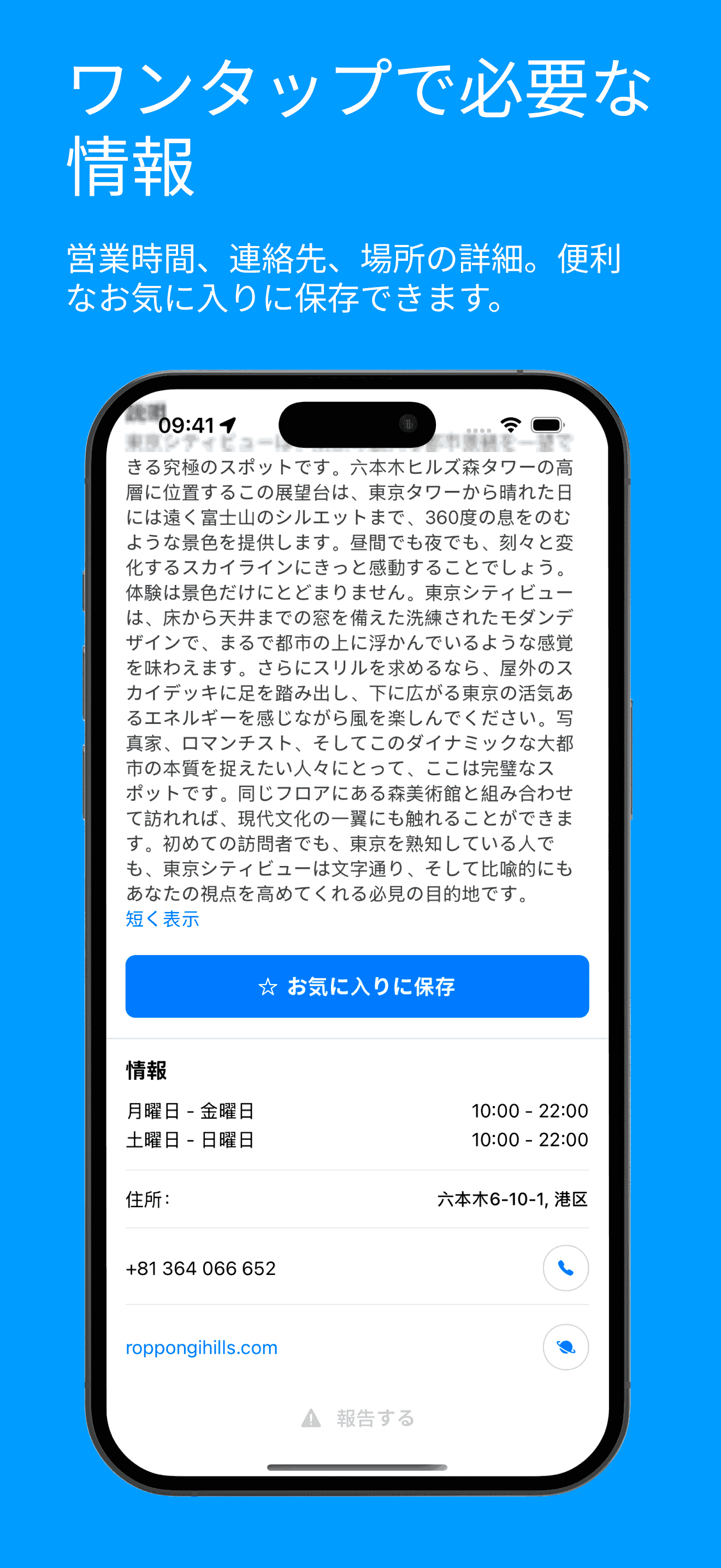 探す時間を節約し、発見に時間を費やしましょう。Visit Tokyoをダウンロードして、今日から探索を始めましょう!