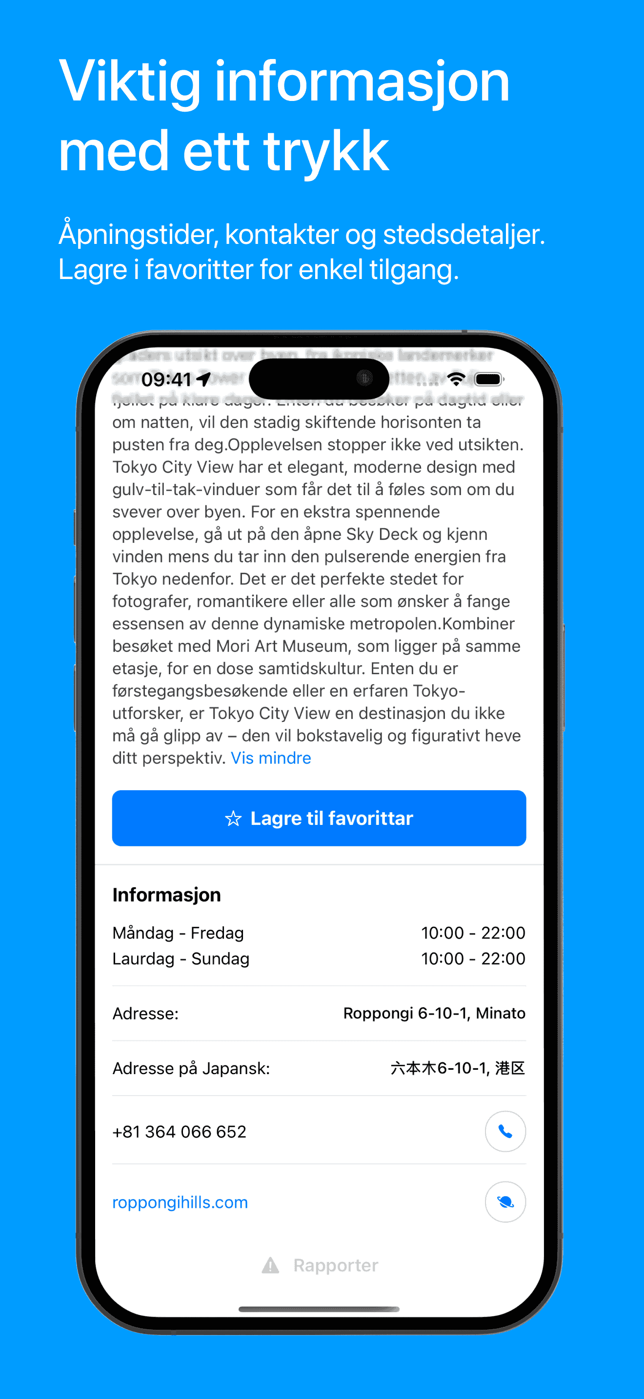 - Detaljert informasjon: Få åpningstider, kontaktinfo og detaljerte beskrivelser for hvert sted.